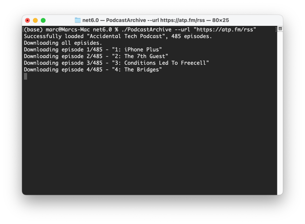 That’s why I’ve written Podcast Archive. A simple Command-line utility written in .NET that downloads an entire podcast feed in a tidy Year > Month > Date folder structure. It’s smart enough not to download files that have already been downloaded, so it’s safe to run over and over again without wasting bandwidth. Files downloaded will have their creation date set to the original publish date, so once downloaded you can easily use tools like Spotlight to search by date.